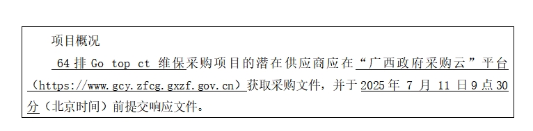 簡(jiǎn)要規(guī)格描述或項(xiàng)目基本概況介紹、用途:64排Go top ct 維保1項(xiàng)。如需進(jìn)一步了解詳細(xì)內(nèi)容,詳見(jiàn)競(jìng)爭(zhēng)性磋商文件。