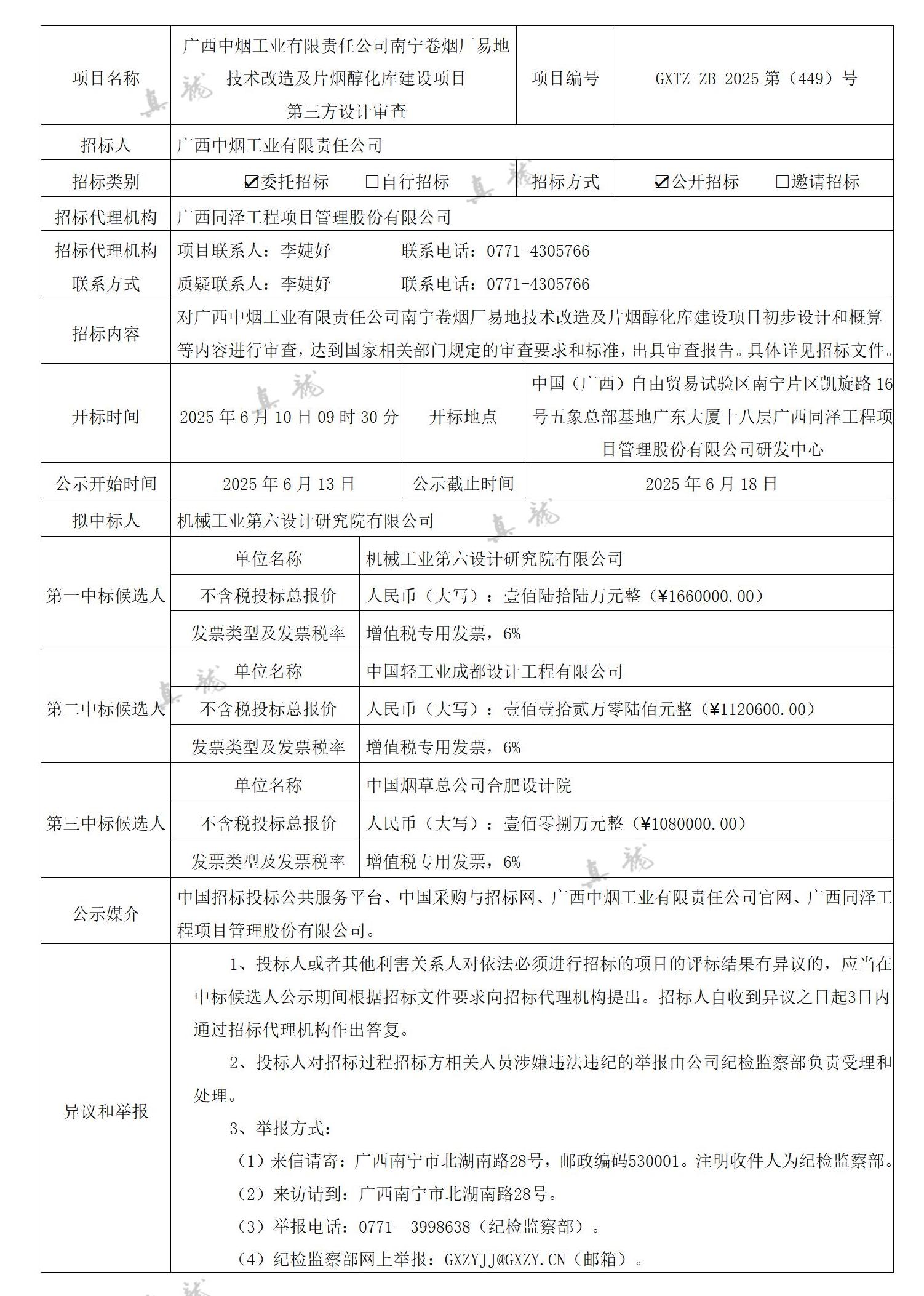 廣西中煙工業(yè)有限責(zé)任公司南寧卷煙廠易地技術(shù)改造及片煙醇化庫建設(shè)項(xiàng)目第三方設(shè)計(jì)審查(項(xiàng)目編號:GXTZ-ZB-2025第(449)號)中標(biāo)候選人公示